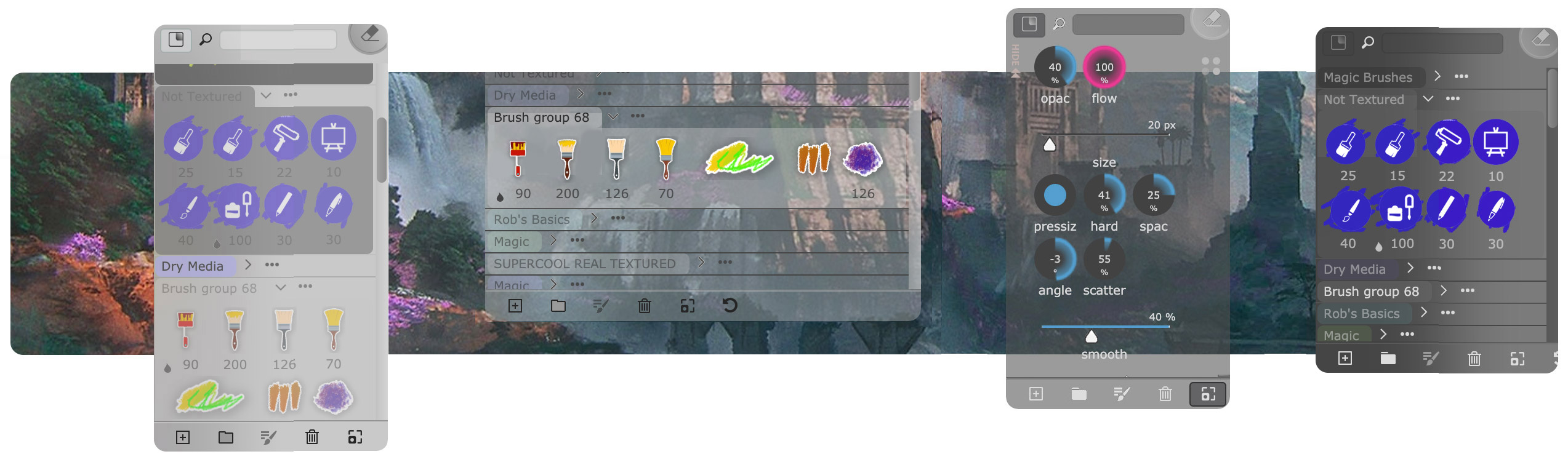 Alt-click on a brush to use it as any tool (Eraser, Dodge, Burn…)- Full Photoshop brush type support—Mixer, physical, textured, patterned, all of them