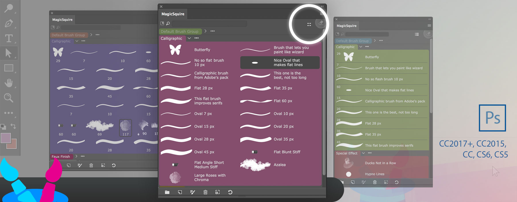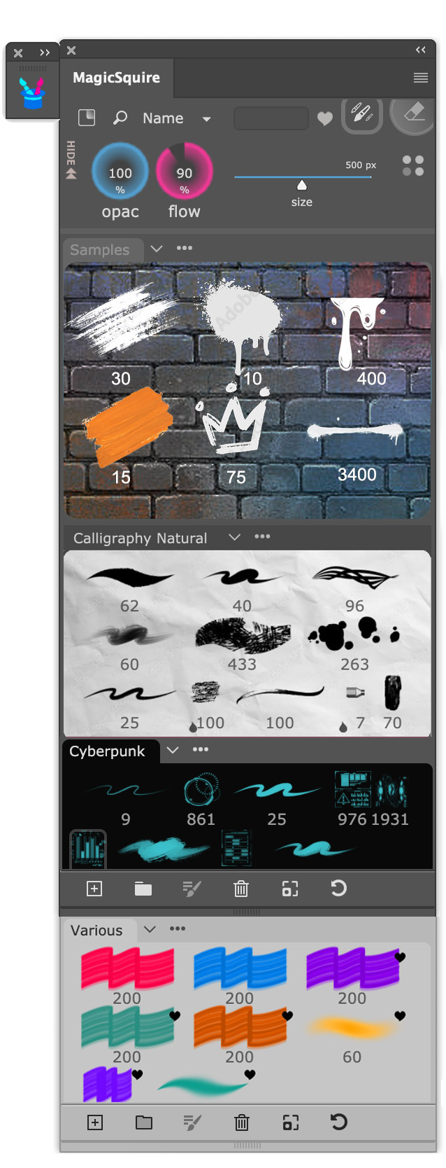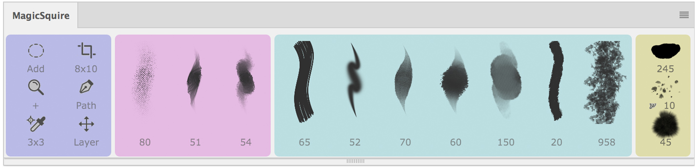 MagicSquire is an elegant solution that lets you sort, organize and keep your brushes in folders. Assign colors to folder. Load .abr and .tpl files. Supports Adobe Photoshop 2024, 2023, 2022, 2021, 2020, CC2019, CC2018, CC2017, CC2015, CC2014, CC, CS6, CS5.5, CS5, Mac, PC (all Windows). Creative Cloud & Creative Suite. The perfect brush companion for your Modbook or Surface!